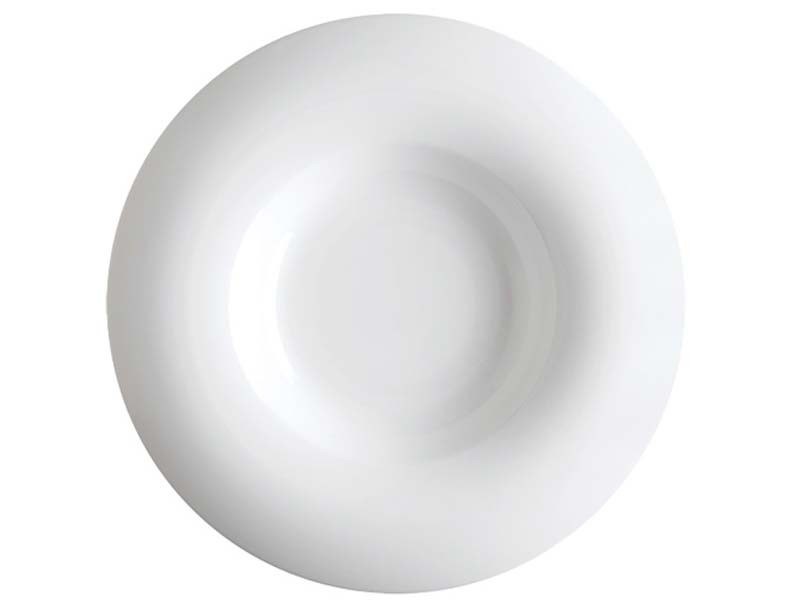Alquiler de plato hondo porcelana blanca de 31cm de diámetro, modelo ARO de la marca de porcelana valenciana Porvasal, un plato con un diseño moderno, perfecto para emplatar platos principales, cremas, ensaladas o cualquier tipo de comida. Cuenta con un ala de 7cm, un cuenco interior de 16cm y una capacidad de 250ml. Tiene una altura de 3,5cm aproximadamente. Resistencia y dureza de máxima calidad.