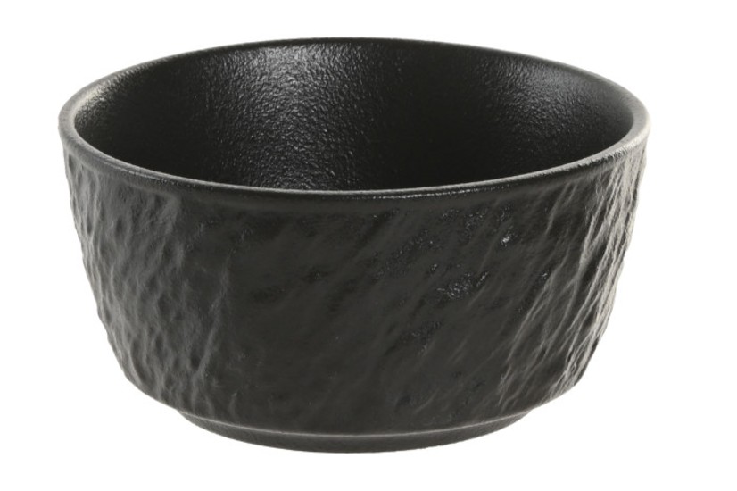 Alquiler bol de porcelana negra de 11,5cm de diámetro, modelo PIZARRA NEGRA, bol acabado en color negro profundo muy uniforme, presenta un acabado irregular y rugoso que imita la apariencia de piedra natural o roca volcánica.