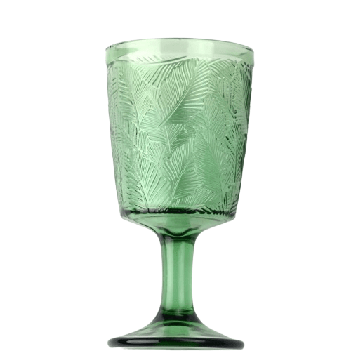 Alquiler de la copa modelo HOJAS VERDE 28,5 cl. de vidrio robusto, grabado de hojas, perfecta en montajes en exterior aportando un toque elegante.
