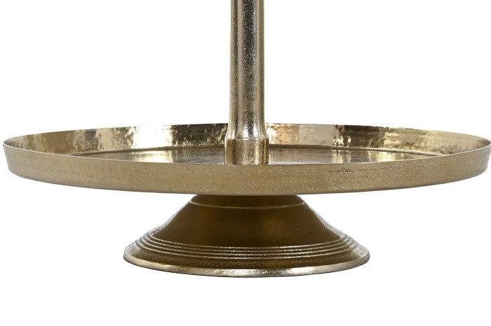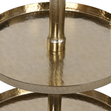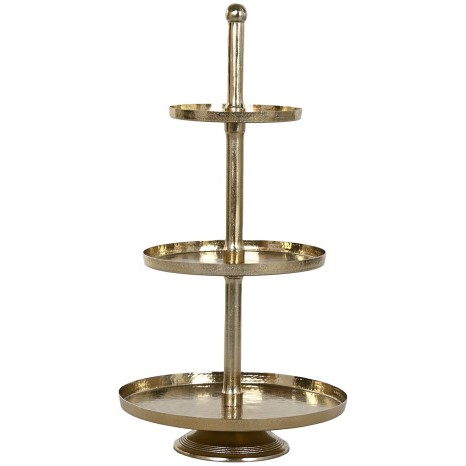 Expositor buffet 3 alturas MARTELE dorado, 88cm de altura, cuenta con tres bandejas redondas de 44,5, 35 y 25cm de diámetro, hecho en metal dorado.