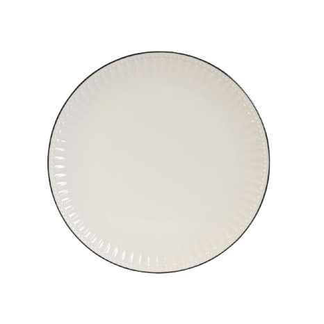 Alquiler de plato de postre, de porcelana, de 21cm de diámetro, modelo FILO NEGRO , un plato en color blanco roto, decorado con un borde negro y relieve tipo perlas. Plato sin ala, lo que le permite una capacidad interior de aproximadamente 19cm y una altura de 1.5cm.